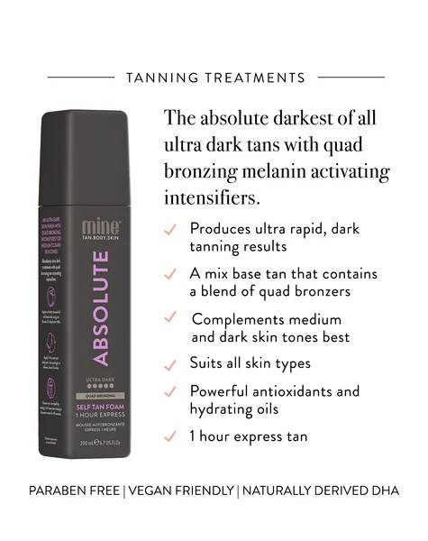 Absolute Self Tan Foam suits all skin types and tones for those looking for the absolute darkest of all ultra dark skin finishes, in as little as 1 hour.