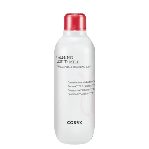 COSRX AC Collection Calming Liquid Mild is a refreshing toner that helps calm and soothes acne, redness and irritation. BHA and PHA help exfoliate dead skin and deep cleanse pores whilst green tea extract gently cares for pores. CentellAC-RX complex gives intense calming and soothing care for the skin. The toner has a fast-absorbing, watery formula that penetrates easily without greasiness.