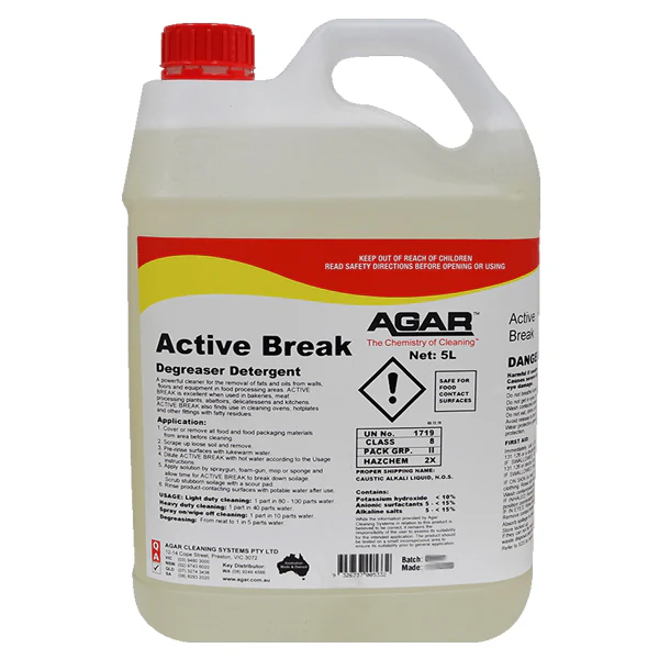 ACTIVE BREAK is a powerful, non-perfumed cleaner for the removal of fats and oils from walls, floors and equipment in food processing areas. It can be applied by the spray-and-wipe method or by mopping or hand-scrubbing.
