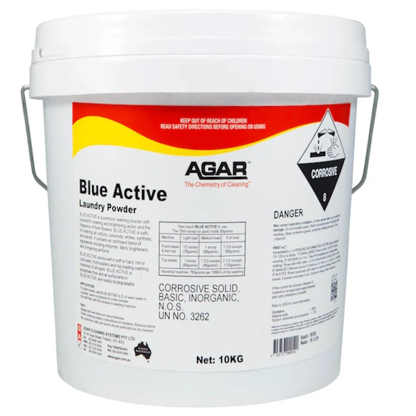 BLUE ACTIVE dissolves readily in water to unleash a barrage of powerful ingredients selected for their ability to emulsify fats and oils, sequester waterhardness ions, digest proteins, bleach out stains, suspend dirt particles, enhance the colours and perfume the fabric. The alkalinity of BLUE ACTIVE is important for extracting soils from the fabrics.