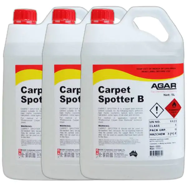 CARPET SPOTTER B is a carpet-stain removal solvent suitable for adhesive tape marks, cosmetics, lipstick, Lysol, mascara, nail polish, some types of ink stain and oil stain.