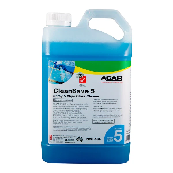 CLEANSAVE 5 is a fast-acting glass cleaner that rapidly penetrates and removes light to medium soil loads leaving sparkling clean windows and mirrors. It has been formulated to produce the lowest possible impacts on both people and the environment, whilst facilitating highly effective and productive cleaning.