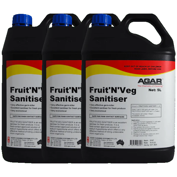 Fruit N Veg Sanitiser is a food-contact approved solution of sodium hypochlorite in water with an available chlorine content of 5% when packed. Because it offers a very effective method of killing undesirable micro-organisms (germs, bacteria, etc.), FRUIT’N’VEG SANITISER is an excellent sanitiser for fresh produce.