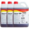 Caution: ONCE OFF can be slippery on smooth tiles. Wear rubber boots with safety treads to avoid slipping. Always DILUTE ONCE OFF BEFORE applying it to floors. Do not allow the solution to come into contact with aluminium, brass, floor polish, marble, terrazzo, wood or carpet. If splashed on any of these surfaces, wash it off immediately. Read the Safety Data Sheet before using this product.