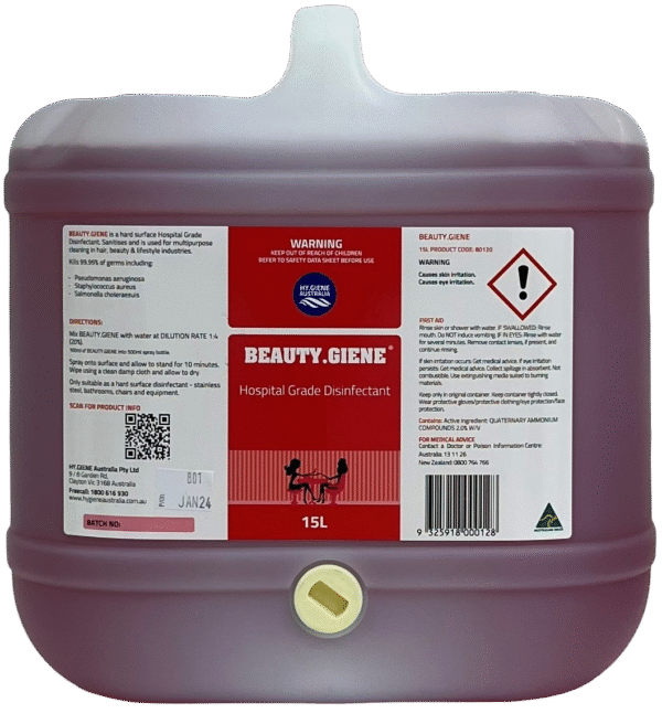 BEAUTY.GIENE is a low forming, clear pink liquid with broad spectrum activity against bacteria and has no fragrance. BEAUTY.GIENE is a high strength sanitiser with a heavy duty cleaning ability and is formulated for use in the hair, beauty & lifestyle industries. It is recommended for cleaning and disinfecting all areas where soiling is of a medium to heavy nature.