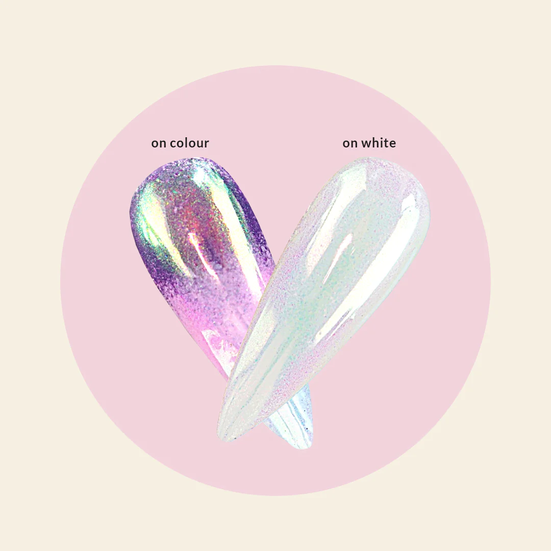 These aurora nail powders have a hidden secret, hidden colours that magically appear like a shimming mirage in the desert. Pinky Candy Floss colours will magically appear as the dominate colour depending on the angle. A beautiful Candy Floss rainbow, or a magical mixed colour rainbow, you decide.
