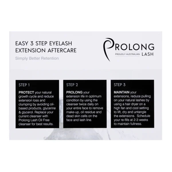 This 50 pack of Prolong Lash’s 3 Step After Card postcards give you the tool you need to walk you client through the Aftercare process using PROLONG LASH CLEANSER CONCENTRATE. An easy take home item for your clients to demonstrate how to care for the new extensions after their first application.