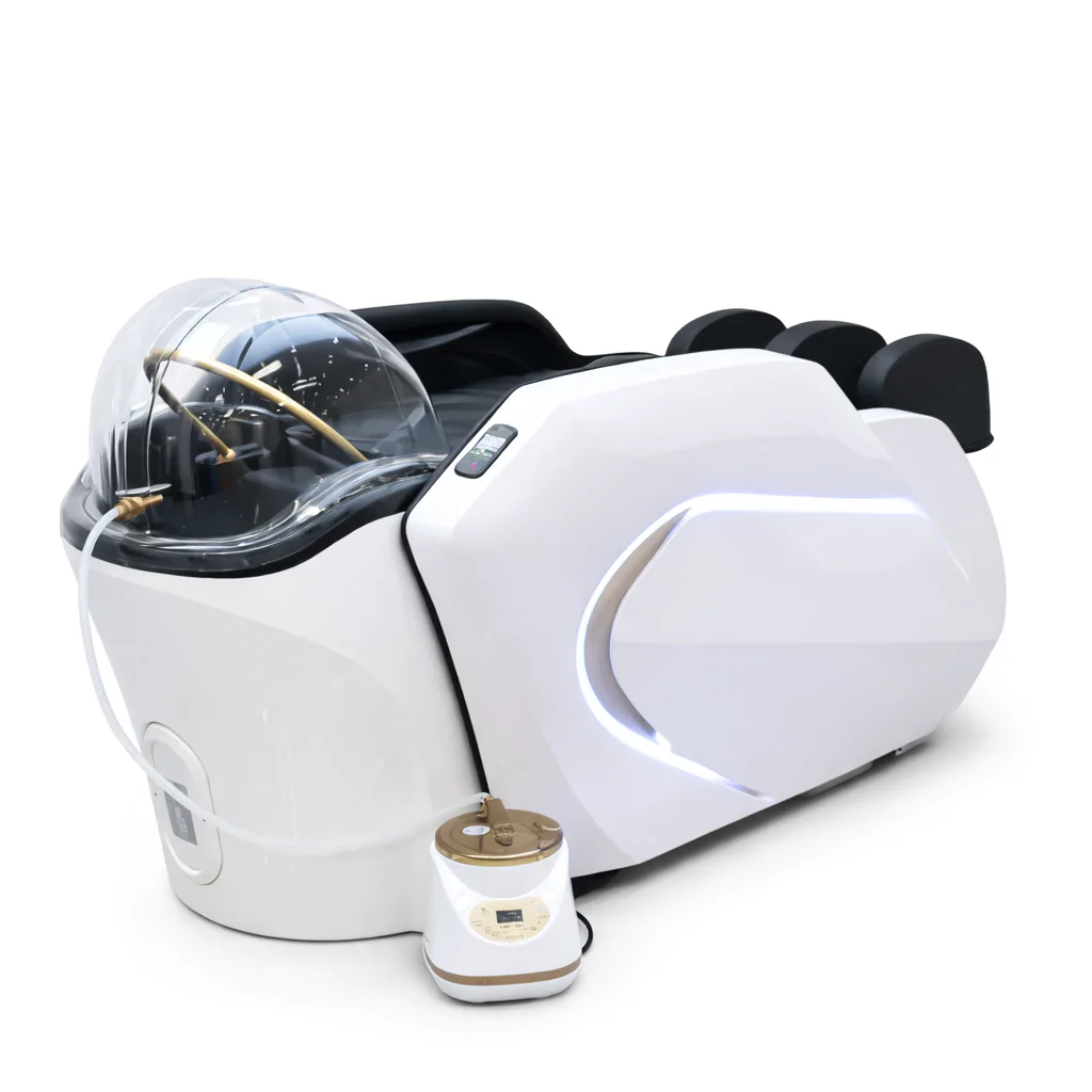 Integrated arm airbags gently compress and release to encourage circulation and relaxation, while dedicated calf muscle airbags provide soothing lower leg compression. The elevating footrest enhances client positioning, creating a cocoon style experience that supports full body comfort from head to toe.