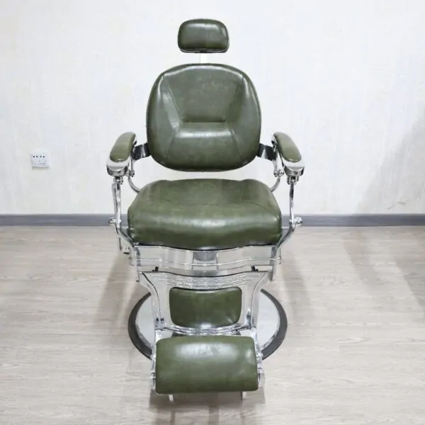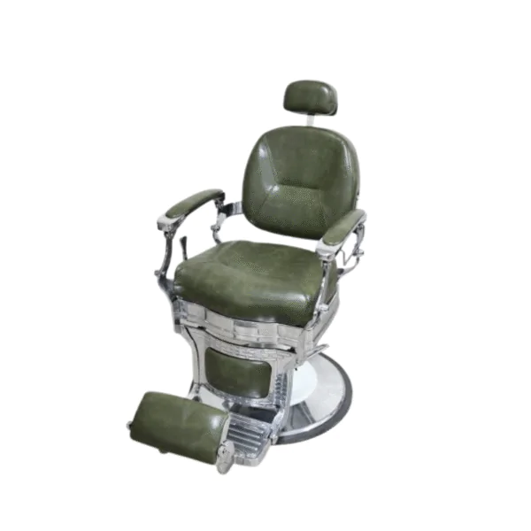 Command attention and deliver premium comfort with the Dominion Barber Chair. Upholstered in a striking olive green leatherette, this chair makes a powerful statement while maintaining timeless barbering tradition. Its sleek chrome-plated frame and classic silhouette balance vintage charm with modern durability, ensuring it withstands the demands of daily professional use.