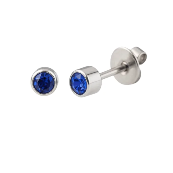 Classic and refined, these sterling silver bezel-set birthstone earrings embody the enduring charm of September’s gem — Sapphire. Each earring features a 3mm deep sapphire-blue crystal encased within a 4mm polished stainless steel bezel, combining timeless elegance with contemporary simplicity.