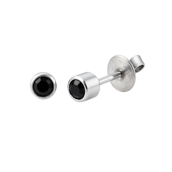 Sophisticated and effortlessly modern, these sterling silver bezel-set stud earrings showcase the timeless allure of jet black crystals. Each earring features a 3mm faceted jet crystal elegantly framed in a 4mm polished stainless steel bezel, offering a sleek and contemporary statement piece suitable for any occasion.