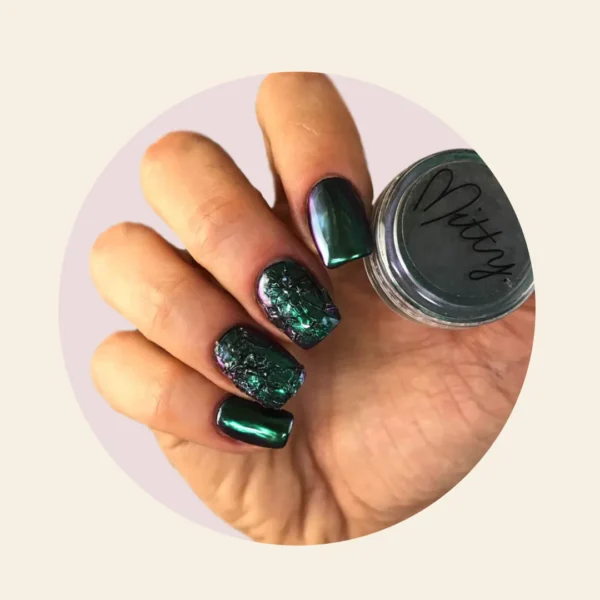 There are different type of powders like chrome powders, shimmer powders, and holographic powder. The difference in these are the pigment used which in return give you the different look.