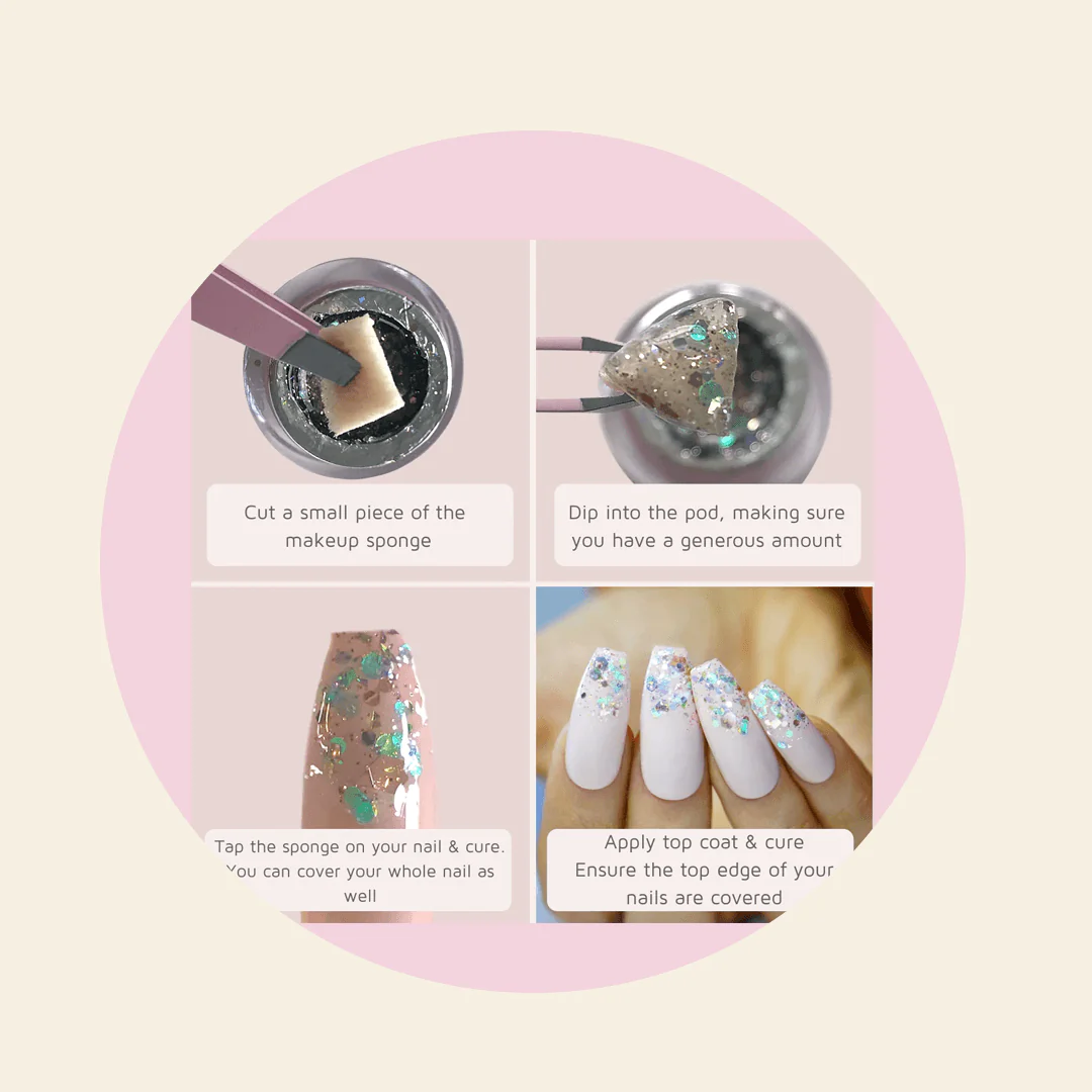 There are two ways you can use a Pixie glitter gel. You can apply it onto your gel nail polish or you can encapsulate (also known as embedding) into your nails.