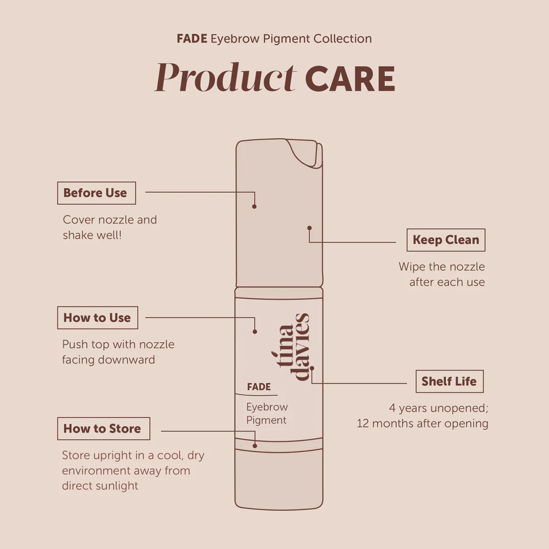 Inorganic-Based, Hybrid Pigments: The FADE Eyebrow Pigment Collection is primarily composed of mineral ingredients designed to fade gradually into a softer, natural color over time without color shifting. Vegan-friendly and cruelty-free.