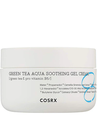 COSRX Hydrium Green Tea Aqua Soothing Gel Cream is a lightweight, non-oily gel moisturiser that instantly hydrates skin with a cooling and soothing effect. The lightweight gel is formulated with Vitamin B5 (D-Panthenol), Camellia Sinensis Leaf Extract, Aloe Leaf Extract, Allantoin. Together, these ingredients calm and soothe redness, blemishes while freshening up skin.