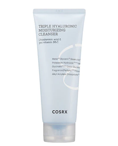COSRX Hydrium Triple Hyaluronic Moisturizing Cleanser is a gentle, dermatologically-tested daily facial wash made with hyaluronic acid and panthenol. It works by eliminating dirt and impurities while restoring skin elasticity and hydration levels, to keep it moisturised even after cleansing. This facial cleanser also helps increase the skin’s moisture retention abilities and enhances skin barrier, which improves its resillience against external stressors.