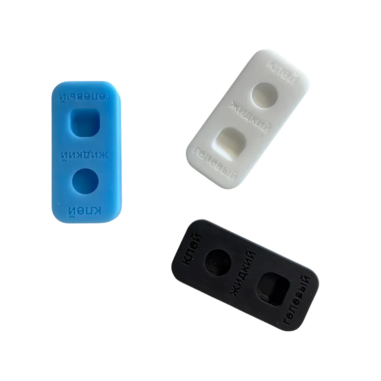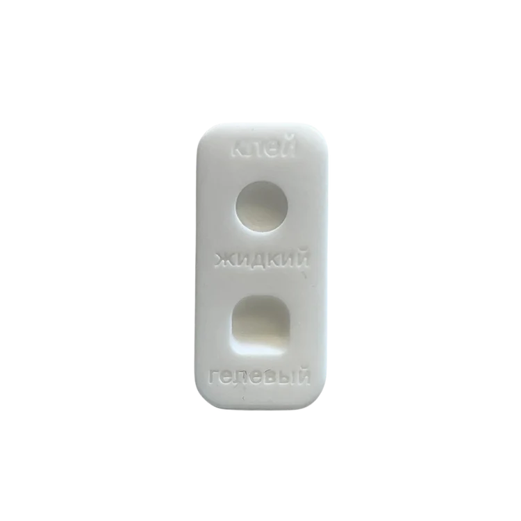 2) The other slot is intended for gel glue/glue balm. This shape features a container with a “slide”. This slide is designed in an angle to carefully pick up or wipe off the the right amount of product. This form allows you to distribute the thickness of the adhesive film over the brush for laying out.