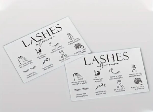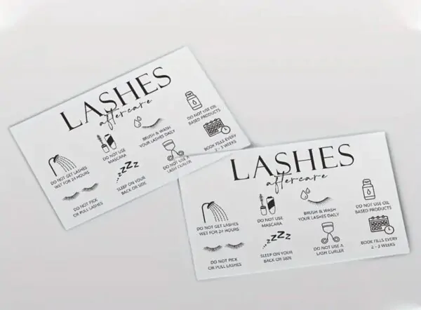 Set clients up for success with the Lash Extension Aftercare Cards – Pack of 50. Printed on smooth, durable cardstock, these cards outline simple do’s and don’ts that reduce premature shedding, minimise touch-ups, and improve overall satisfaction. The clean, photo-ready design leaves space for your logo and booking details, turning every card into a subtle rebooking reminder.