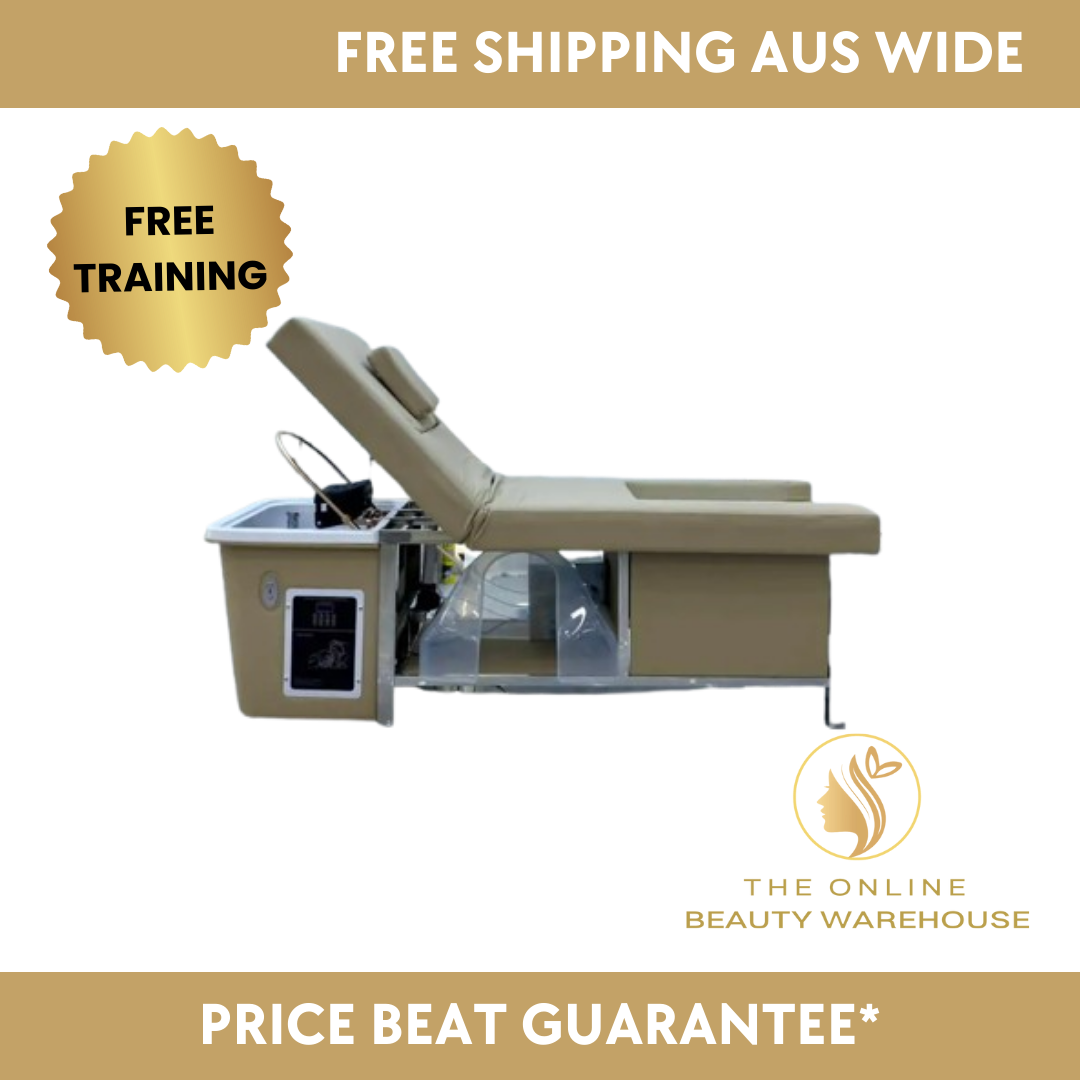 Pedicure Basin – Plumbed – With Steamer. Designed to elevate both the client experience and your workspace efficiency, this all-in-one unit combines a deluxe head spa chair, a deep foot basin, and a powerful steamer for a complete rejuvenation package.
