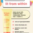 give your skin the bright future it deserves with this illuminating body serum. we’ve got skin loving ingredients hyaluronic acid, niacinamide, licorice root + vitamin c all out here to transform that drab skin & get lit. the skin-brightening & antioxidant rich blend works to reduce inflammation & redness; soothe uneven texture & tone; protect skin from environmental damage and help treat hyperpigmentation for illuminated, glowy skin. so, the gang’s all here, let’s get lit!