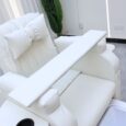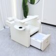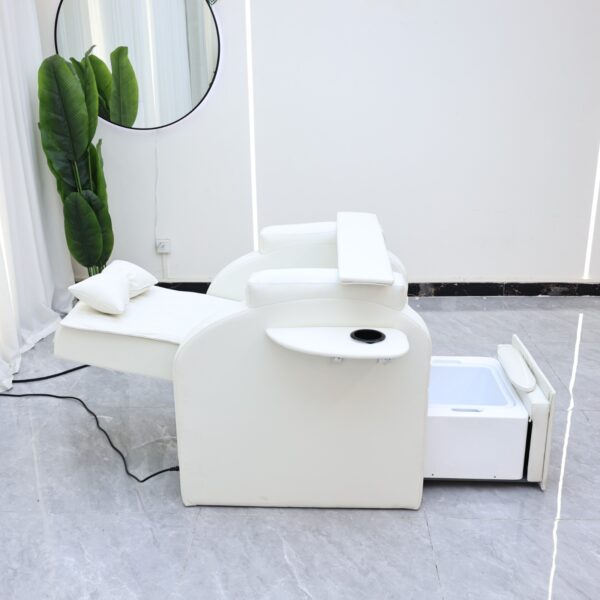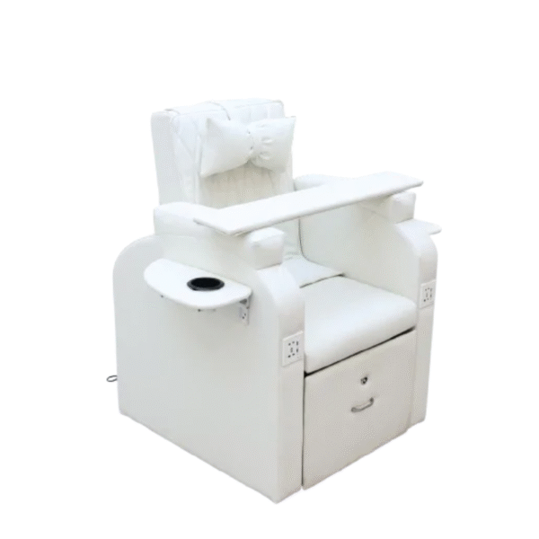 Its ergonomic structure ensures optimal comfort, featuring a high-density foam seat, plush backrest with a bow cushion, and a detachable arm tray for versatile treatments. The side utility pockets and USB/power ports offer additional convenience, while the sleek, white finish complements any professional salon or spa décor.