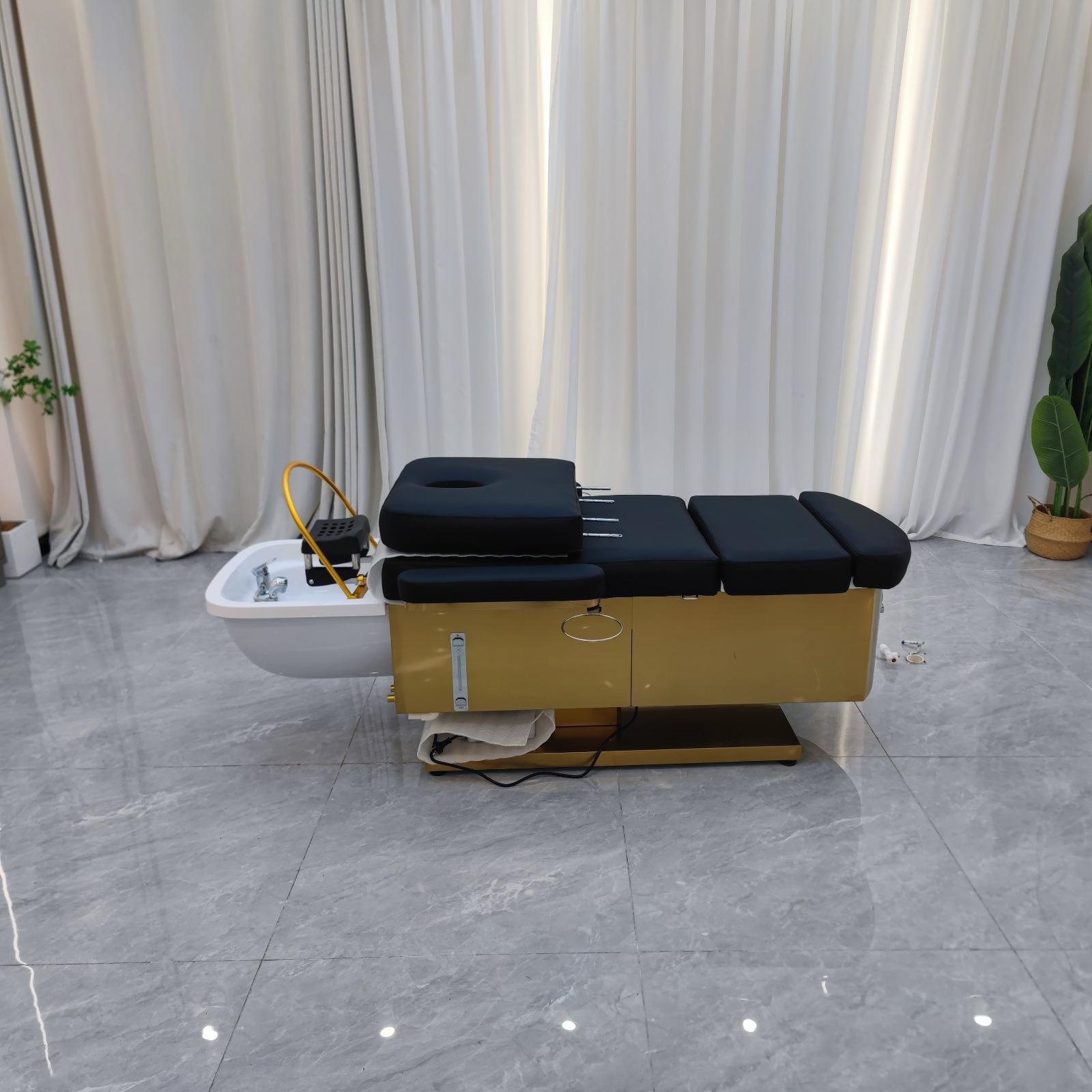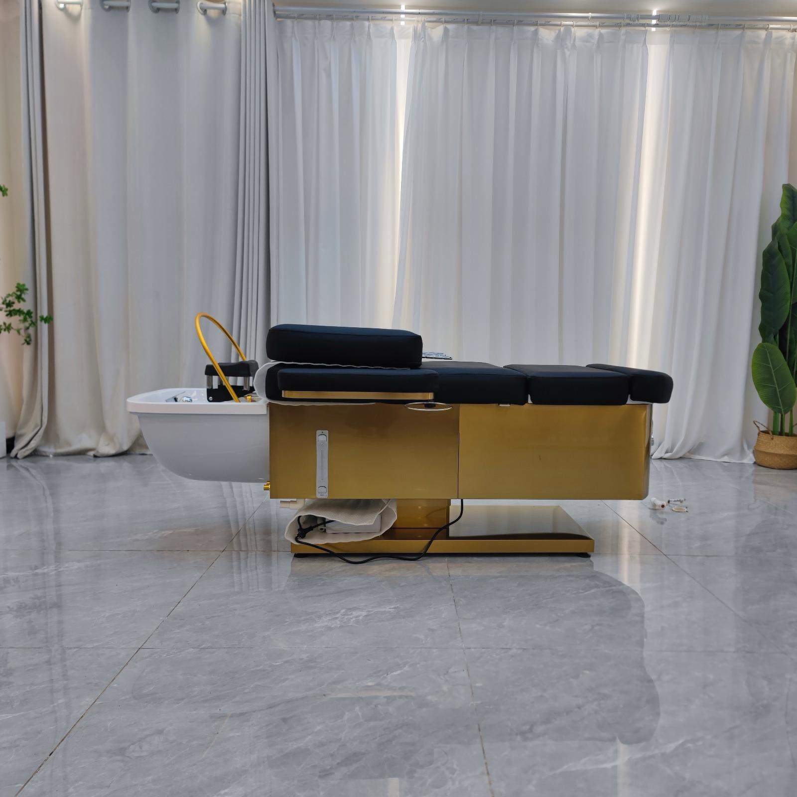 Equipped with a head spa basin and a pedicure basin, both featuring water jets and dedicated shower head handles, allowing seamless transitions between treatments.