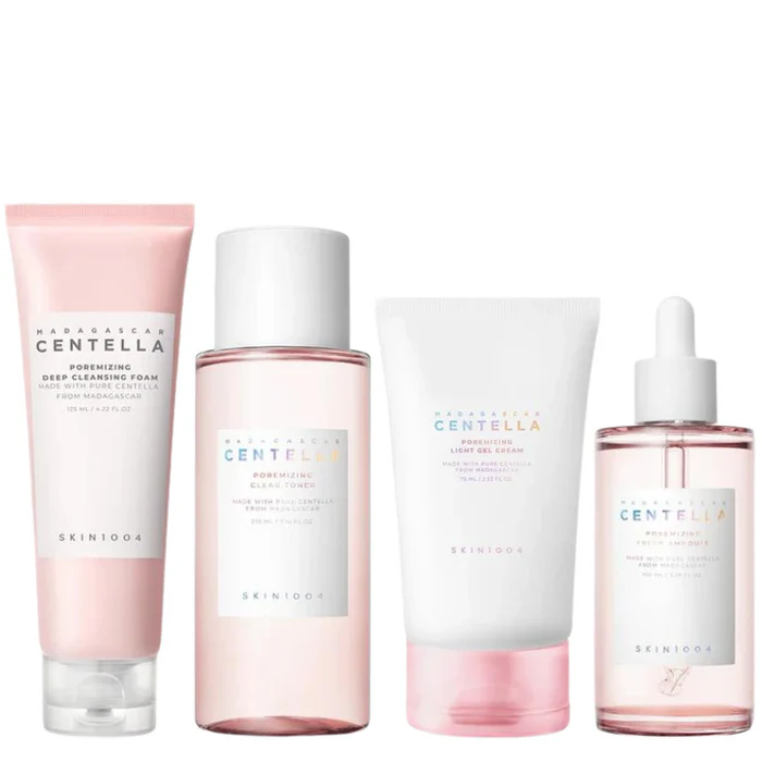 SKIN1004 Madagascar Centella Poremizing Set: a targeted skincare regimen designed to rejuvenate skin and minimize enlarged pores. This set works together to purify and reduce enlarged pores, control sebum, and hydrate skin for a refreshed complexion.