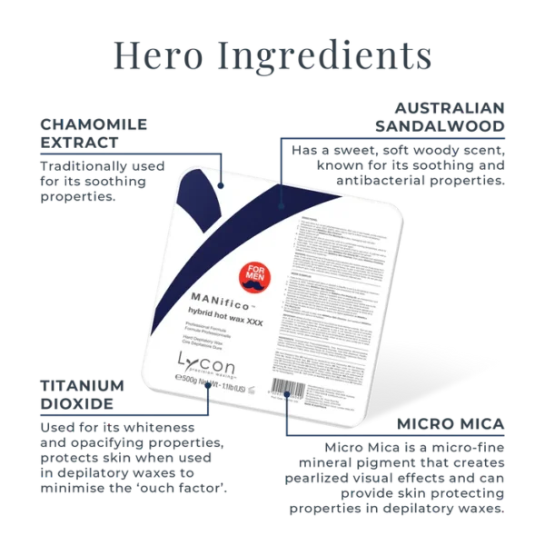 A precise blend of the LYCON traditional hot wax and LYCOtec film wax formulas for extra comfort and pliability, MANifico Hybrid Hot Wax is the ultimate gentle and efficient wax for men’s sensitive skin.