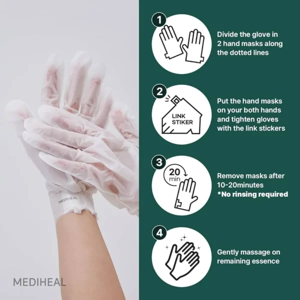 - Remove gloves after 10-20 minutes and lightly pat the remaining essence into skin. (No need to rinse).