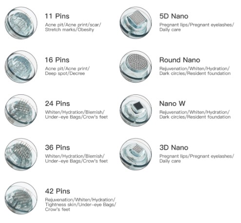 Nano Needles: Designed for ultra-fine microneedling, the Nano needle cartridge is used for very gentle treatments, including hair restoration, pigmentation issues, and sensitive areas like under the eyes.