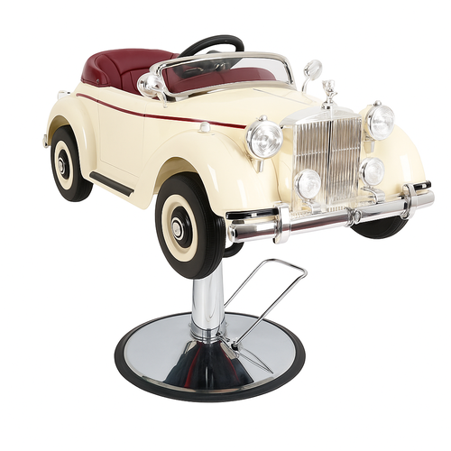 The Mini Monarch Kids Hairdressing Chair is the perfect blend of timeless sophistication and playful imagination. With its cream-ivory finish, glossy chrome details, and plush maroon seat, this vintage-style car chair gives every little client the royal treatment. Designed to turn haircut time into a fun, regal adventure, it keeps children comfortable, calm, and delighted throughout their appointment.