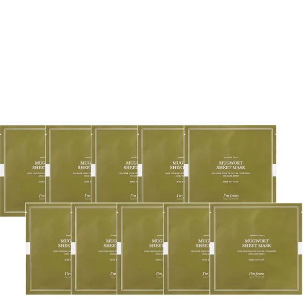 I’M FROM Mugwort Sheet Mask Bundle (10pcs) is enriched with 91.45% Mugwort Extract that helps calm and soothe dry, irritated and sensitive skin. The antibacterial properties of mugwort make it great for soothing inflammatory acne. The mask sheet is made from plant-based fabric certified by OEKO-TEX which adheres well onto the face to allow the rich mugwort essence to be delivered to the skin.