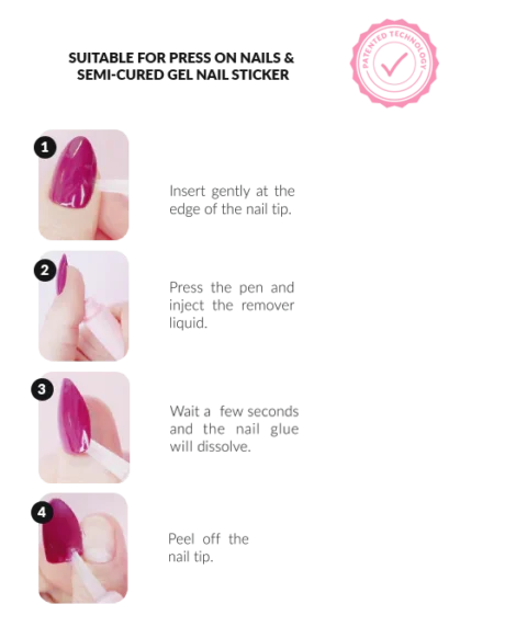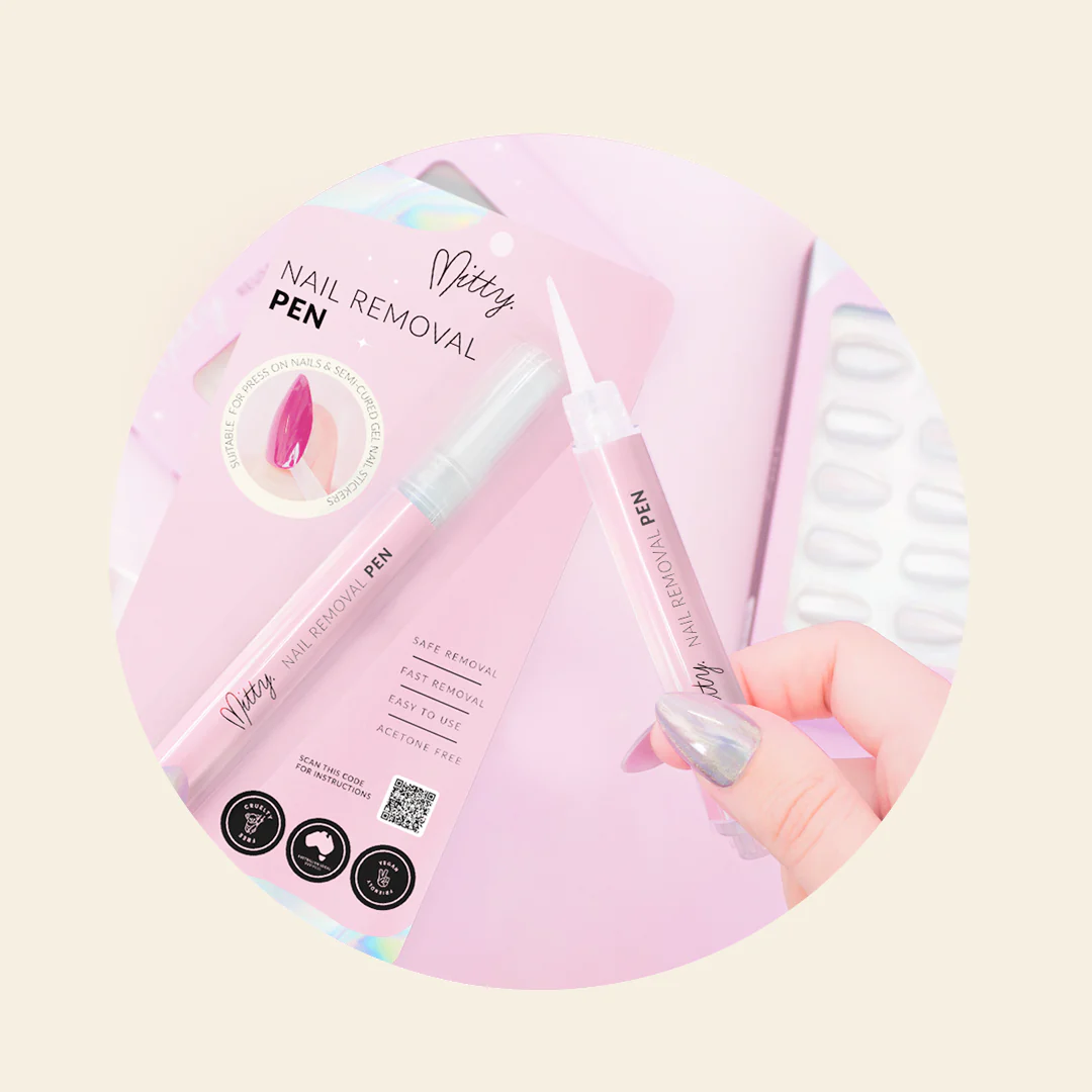 The Mitty Nail Removal Pen revolutionises the process of removing press-on nails and semi-cured gel stickers. It is entirely safe, effortless, and swift, ensuring no harm to your nails or precious reusable press-on nails. Plus, it’s 100% pure vegan and cruelty-free.