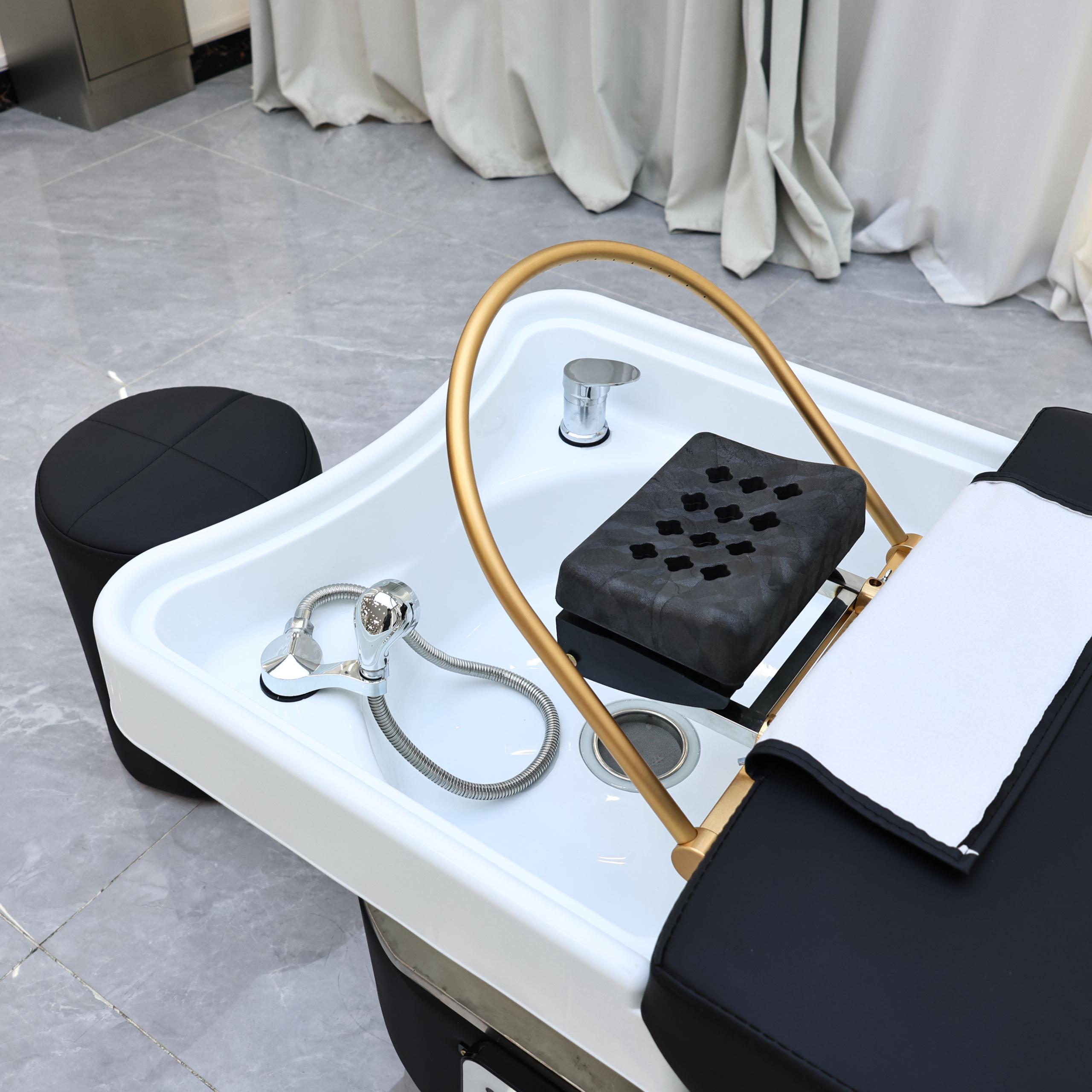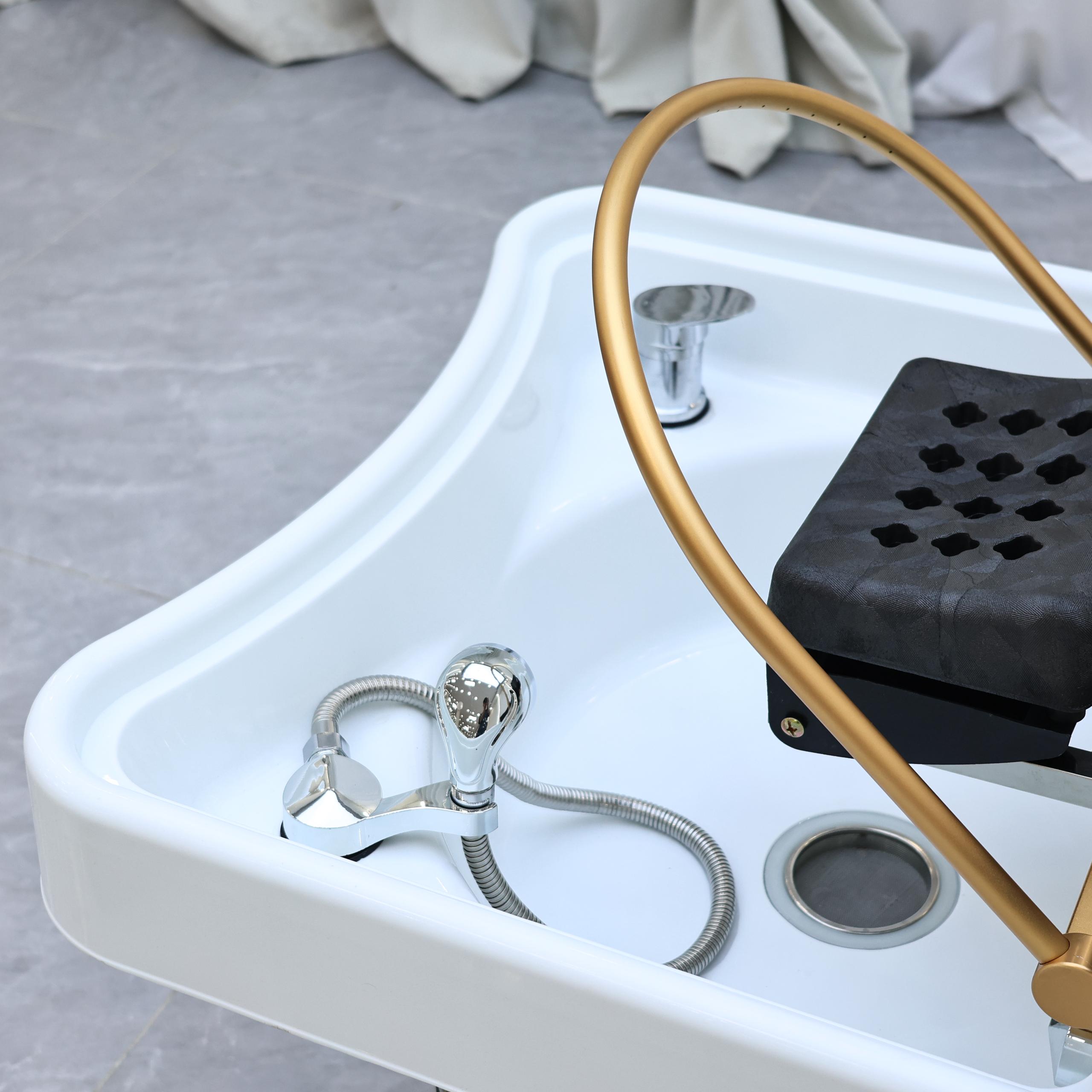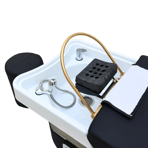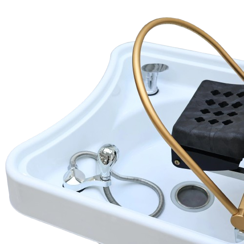The deep bowl, ergonomic design, and water drainage system provide a practical and hygienic setup that meets salon standards.