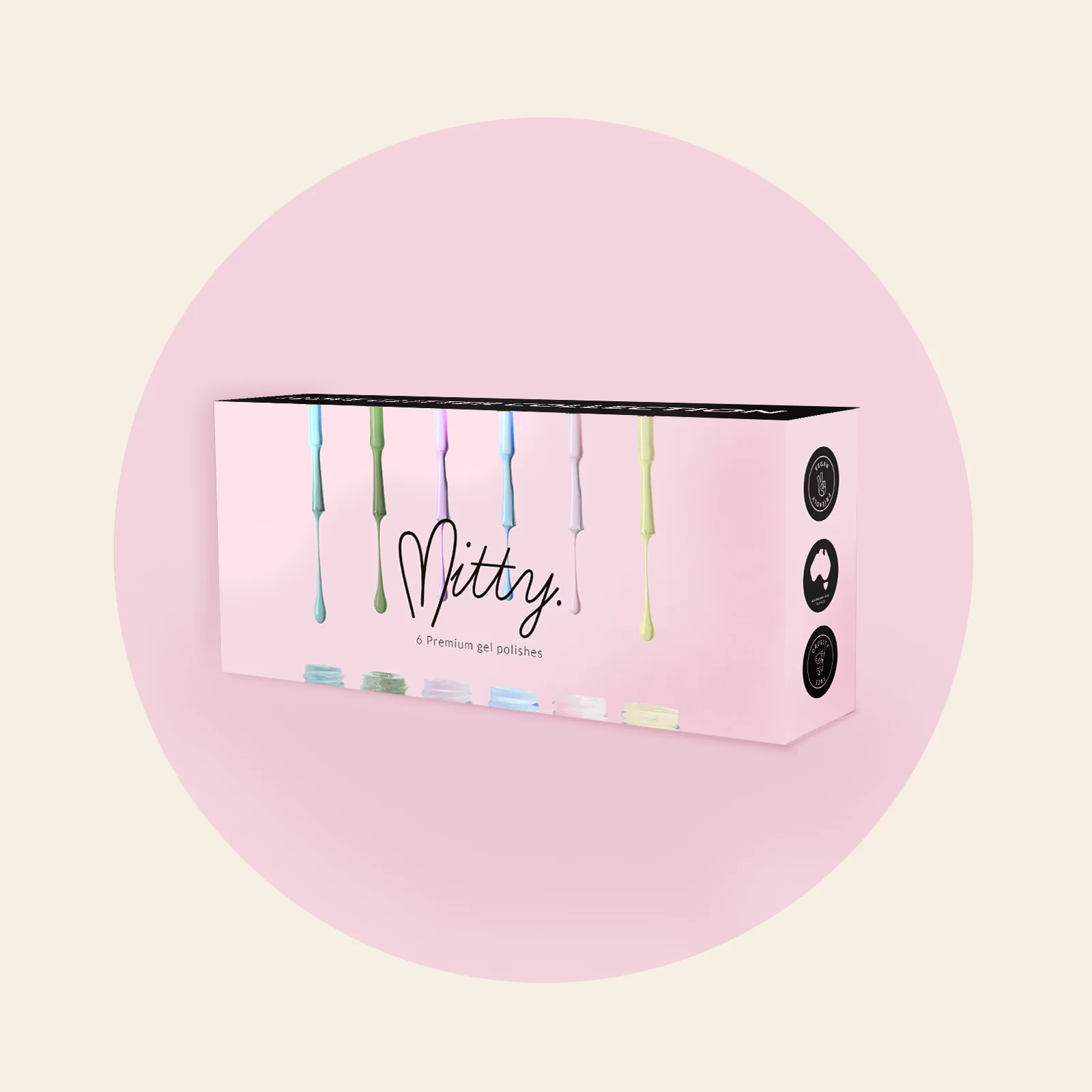 Fall in love with Mitty curated Pastel Gel polishes. These clean and cool pastel gel polishes are this seasons must have colours. Use them as a standalone or let your creative side flow with some cute nail art!