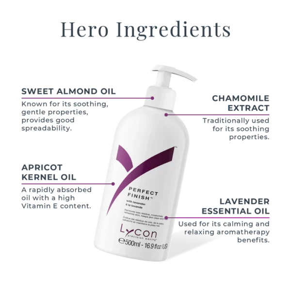 A perfect way to end a waxing treatment. Perfect Finish removes sticky strip wax residue, while soothing and nurturing at the same time. Contains Lavender, well known for its calming benefits.