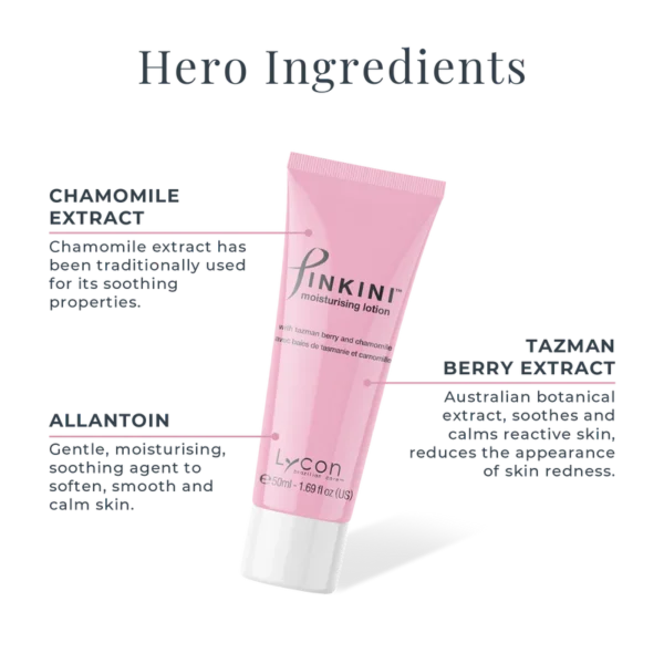PINKINI Moisturising Lotion is light and refreshing, formulated with soothing Chamomile, Allantoin and Tazman Berry. This nourishing lotion is pleasantly scented, while it calms, moisturises and protects the skin after waxing.