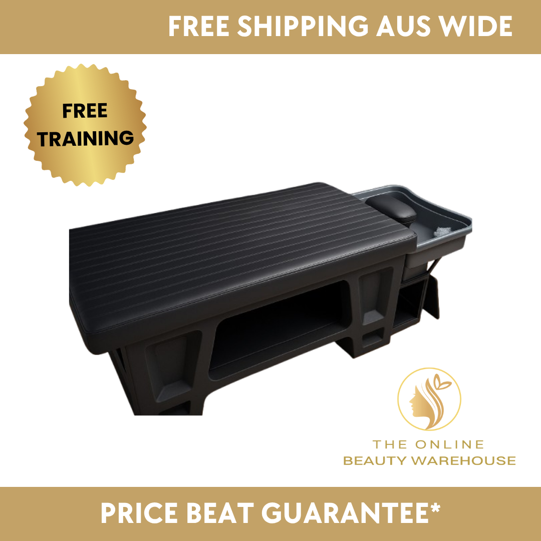 The premium cushioned surface ensures maximum client comfort, while the integrated basin attachment provides seamless workflow for stylists and therapists. Built from strong, long-lasting materials, the Pure Flow Spa offers excellent stability and a spacious lower shelf for convenient storage of towels, bowls, and tools.