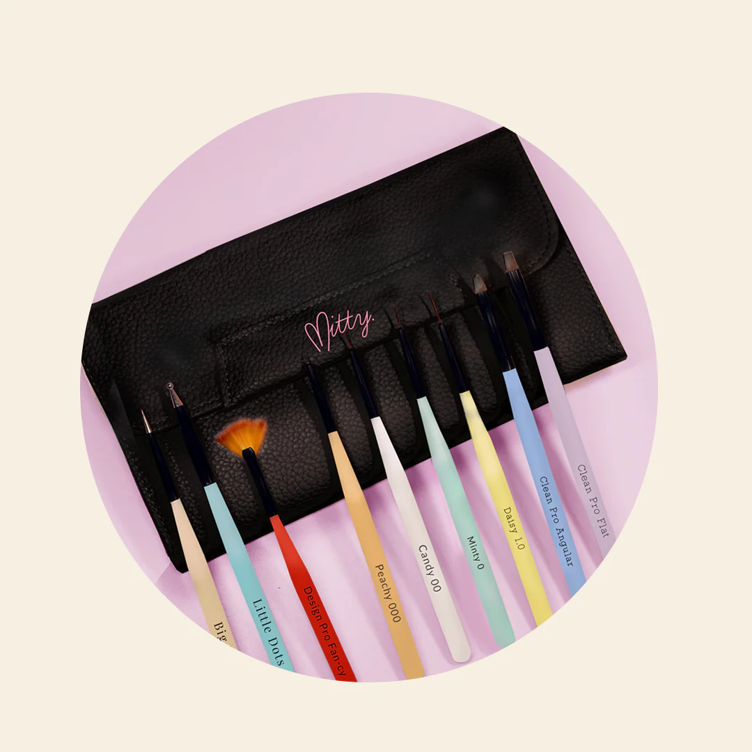 Medium bristles like Mitty Candy 00 & Minty 0: These nail art brushes are designed to for curved lines, shaped French tips, lettering, geometric shapes and line work. if you are a beginner at nail art, we recommend to use Candy 00 for shorter lines and Minty 0 for longer lines and curves.