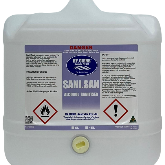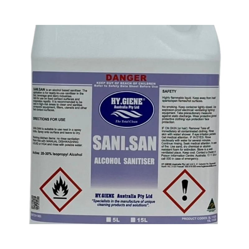 SANI.SAN is an alcohol surface sanitiser disinfectant. The application is for ready-to-use sanitising in the food, beverage and dairy industries. Is suitable for use as a mid-shift disinfectant. SANI.SAN is safe for use on food contact surfaces and evaporates rapidly, leaving virtually no residue. It is recommended to be used in high-risk areas to clean and disinfect conveyors, fillers and other equipment after small product spillages etc.