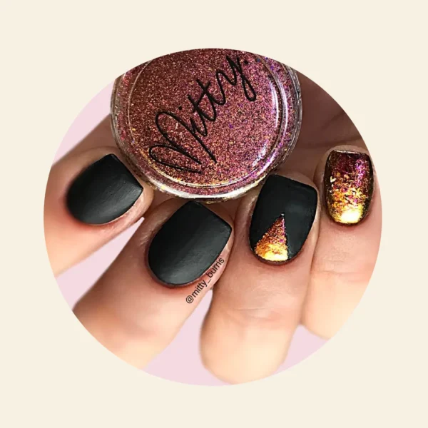 Bling, Bling, Bling. So sparkly you need sunglasses. Mitty shattered chrome flake  is so amazingly awesome we cannot control our excitement. The particle size & quality is the best ever produced. The Micron count is just amazing. What does this mean? SPARKLES. And, Mitty shattered chrome flake will capture the light and reflect back at hundreds of different angles, the colours just appear to dance on your nails.