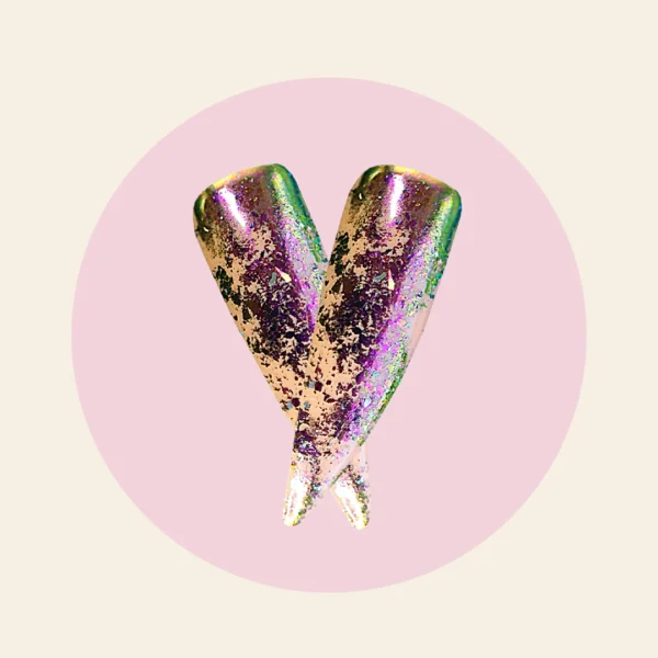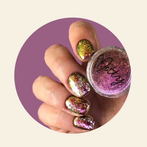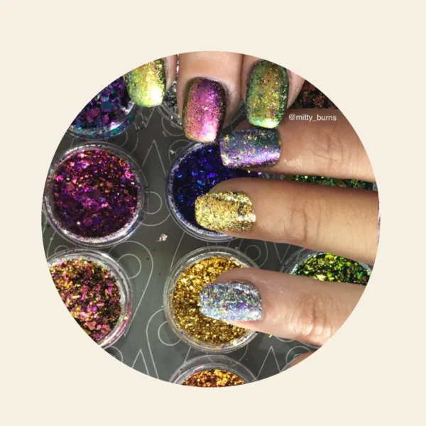 Bling, Bling, Bling. So sparkly you need sunglasses. Mitty shattered chrome flake  is so amazingly awesome we cannot control our excitement. The particle size & quality is the best ever produced. The Micron count is just amazing. What does this mean? SPARKLES. And, Mitty shattered chrome flake will capture the light and reflect back at hundreds of different angles, the colours just appear to dance on your nails.