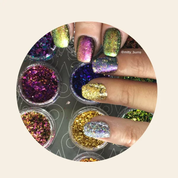 Bling, Bling, Bling. So sparkly you need sunglasses. Mitty shattered chrome flake is so amazingly awesome we cannot control our excitement. The particle size & quality is the best ever produced. The Micron count is just amazing. What does this mean? SPARKLES. And, Mitty shattered chrome flake will capture the light and reflect back at hundreds of different angles, the colours just appear to dance on your nails.