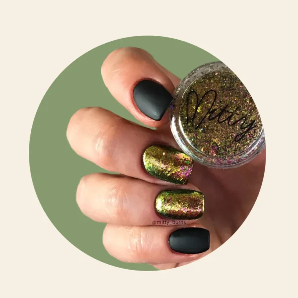 Bling, Bling, Bling. So sparkly you need sunglasses. Mitty shattered chrome flake is so amazingly awesome we cannot control our excitement. The particle size & quality is the best ever produced. The Micron count is just amazing. What does this mean? SPARKLES. And, Mitty shattered chrome flake will capture the light and reflect back at hundreds of different angles, the colours just appear to dance on your nails.