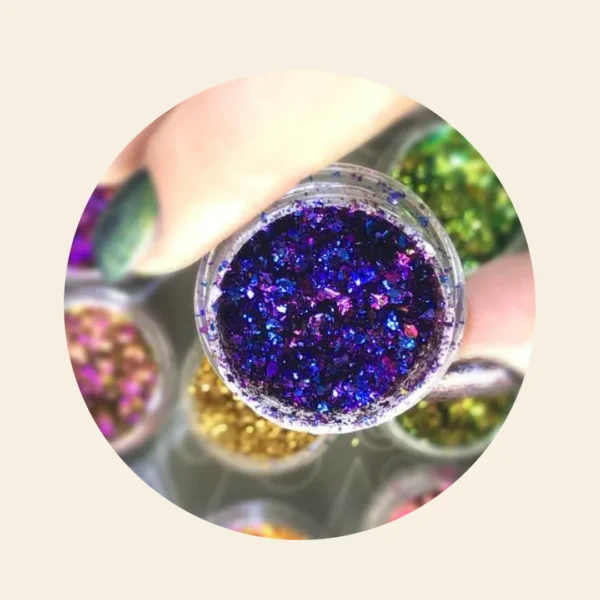 Bling, Bling, Bling. So sparkly you need sunglasses. Mitty shattered chrome flake is so amazingly awesome we cannot control our excitement. The particle size & quality is the best ever produced. The Micron count is just amazing. What does this mean? SPARKLES. And, Mitty shattered chrome flake will capture the light and reflect back at hundreds of different angles, the colours just appear to dance on your nails.