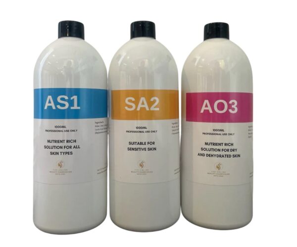 The Solution – Hydrodermabrasion 1000 ml range offers a complete professional system formulated to enhance results in hydrodermabrasion and facial treatment devices. Developed for clinical precision and visible results, this 3-step system includes AS1, SA2, and AO3 solutions—each tailored to a specific stage of the treatment process for cleaner, smoother, and healthier-looking skin.