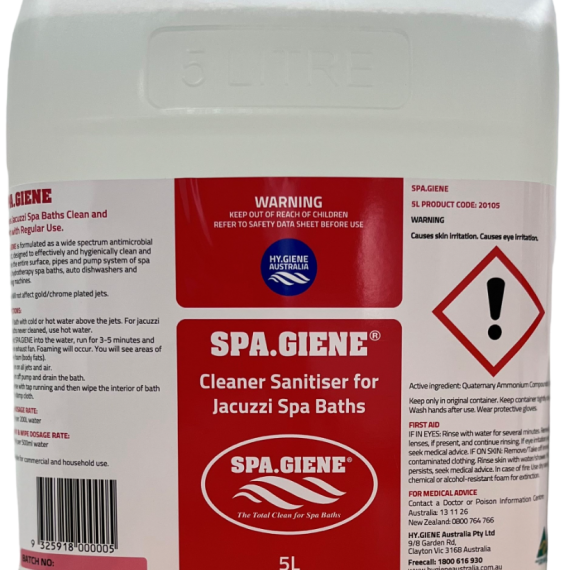 SPA.GIENE spa bath cleaner & sanitiser breaks down and dislodges the body fat, hair, organic matter and biological waste from the pump system of jacuzzi’s and spa baths. The use of SPA.GIENE eliminates the harmful bacteria PSEUDOMONAS AERUGINOSA – a major cause of infection from ‘DIRTY’ spa baths.