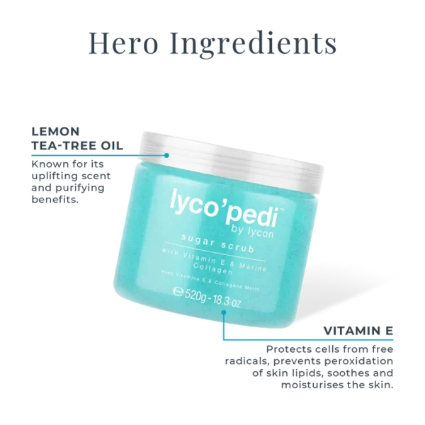 Effectively exfoliates and removes dead skin cells without harsh scratching. The lyco’pedi Sugar Scrub is oil-free, will not stain towels and conveniently does not scatter all over the floor as you do your magic.