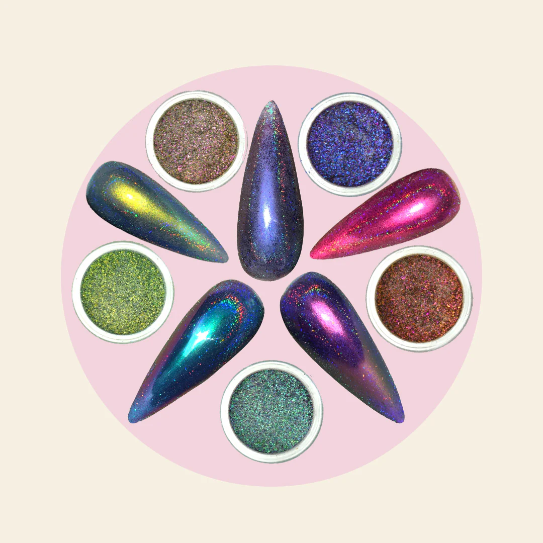 There are different type of powders like chrome powders, shimmer powders, and holographic powder. The difference in these are the pigment used which in return give you the different look.