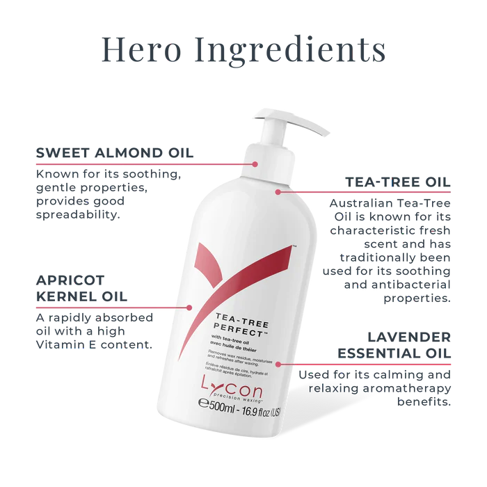 A perfect way to end a waxing treatment. Tea-Tree Perfect is non clogging, removes sticky strip wax residue, while soothing and nurturing at the same time. Contains Tea-Tree Oil, well known for its anti-bacterial benefits.